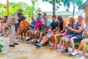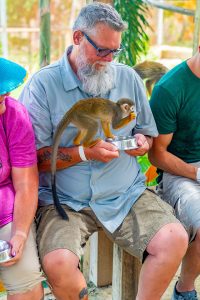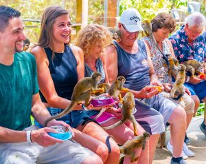 A visit to Monkey Land. In the tropical jungle, listen to the sounds of nature while keeping an eye out for the cute little squirrel monkeys that abound in this natural environment. Trained staff give you a plate of fruit that you can offer to the monkeys. These cheeky, friendly creatures love shiny objects — hang on to your belongings or they will relieve you of loose items for later play. This is an awesome opportunity to get up close with these loveable, fun little monkeys. At the end of the Tour, will have adequate time to buy the memories of this unique and special adventure.