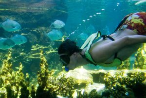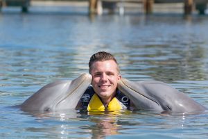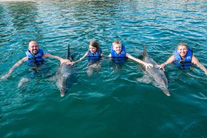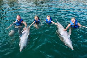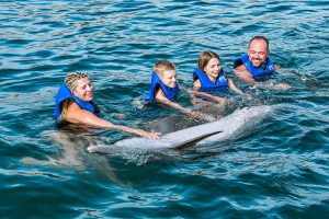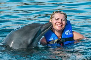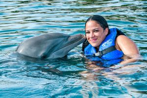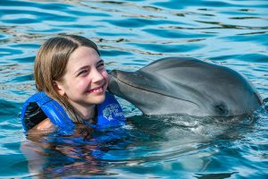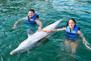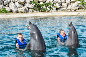 Swim up close and personal with 2 playful dolphins in this VIP adventure. Your experience begins with a brief lecture to learn about these wonderful sea creatures. Then hop on to receive a kiss, a hug and enjoy an amazing ride through the lagoon on top of a boogie board, amazing memories to last forever. During your visit snorkel in a coral reef aquarium, feed lovebirds and enjoy a handful of activities at no additional cost.